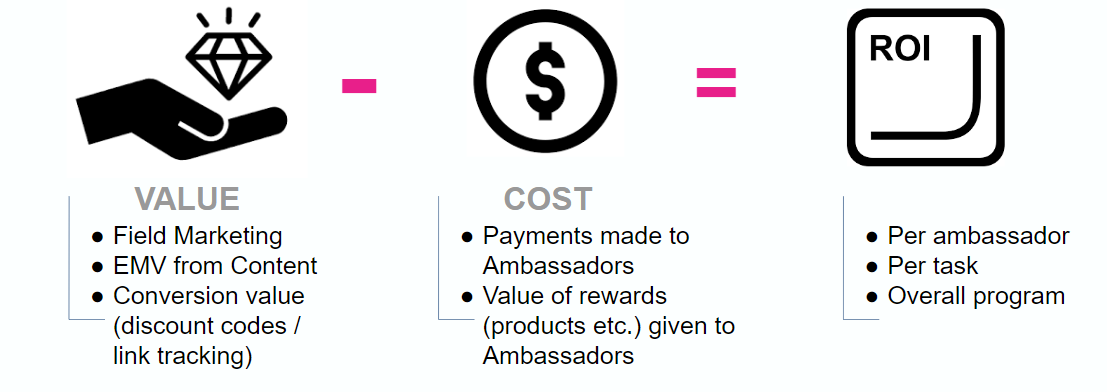 Figure out how much you can spend on your ambassador community. Determine the value that each completed ambassador task is worth to your brand. What does the ambassador return on investment % need to be for the program to be a success