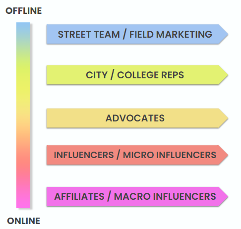 People who are hired and paid to represent your brand in the real world, primarily creating physical impressions. They complete tasks like hanging flyers, passing out samples, and hosting events.